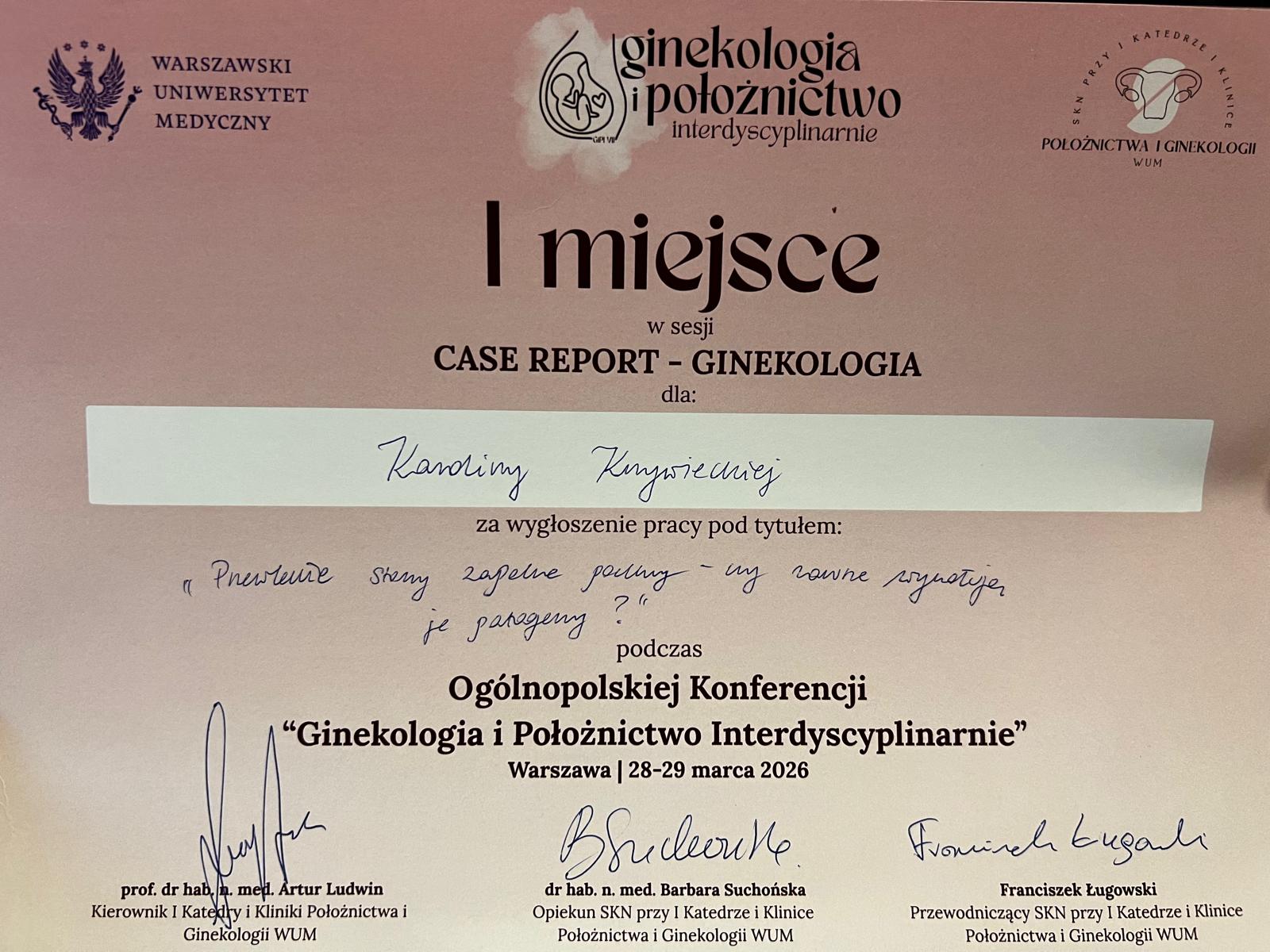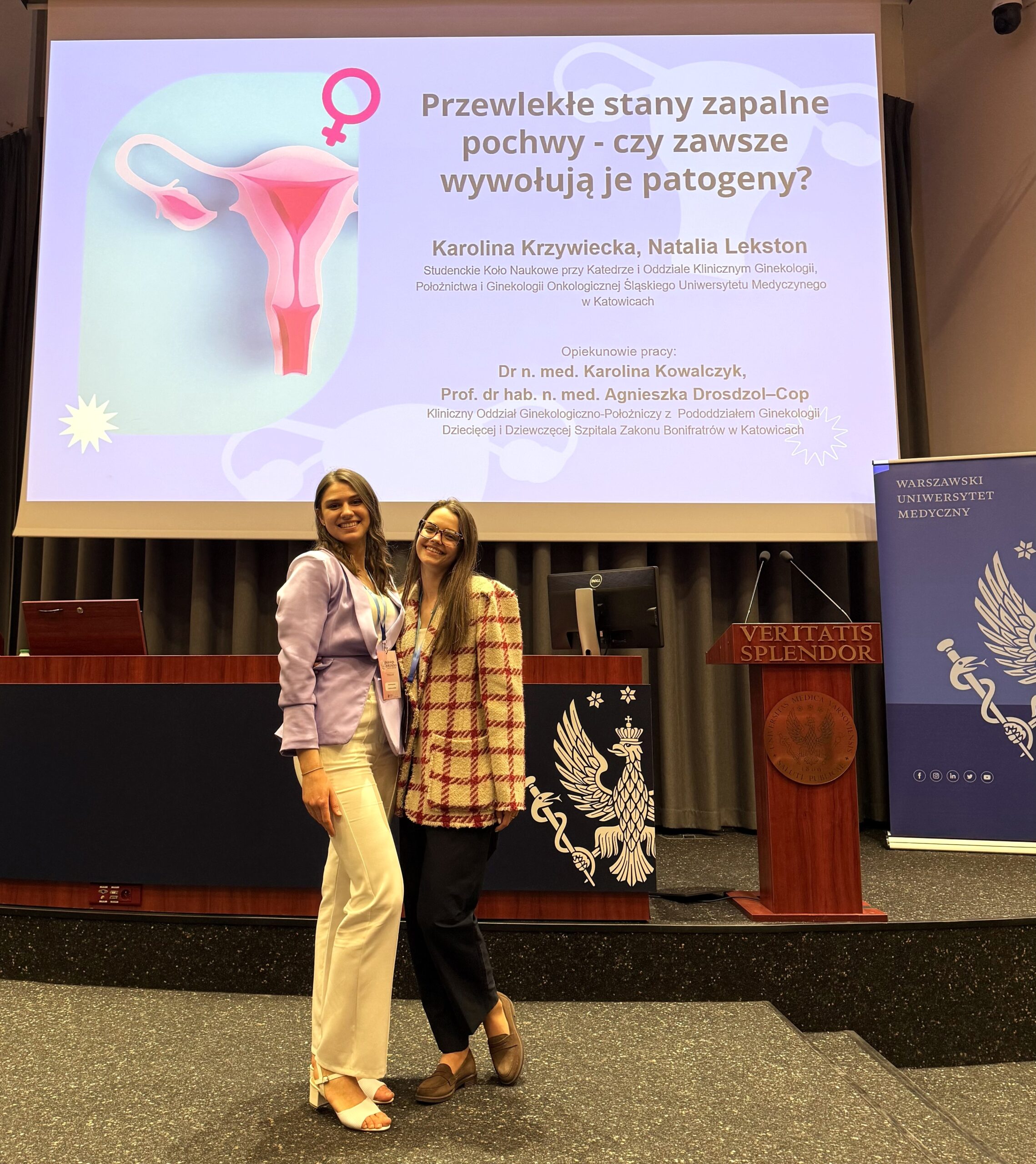 To ogromny sukces studentek Karoliny Krzywieckiej i Natalii Lekston działających w SKN przy Pododdziale Ginekologii Dziecięcej i Dziewczęcej (Katedra i Oddział Kliniczny Ginekologii, Położnictwa i Ginekologii Onkologicznej SUM), który mieści się w Szpitalu Zakonu Bonifratrów w Katowicach. Studentki zajęły I miejsce na Ogólnopolskiej Konferencji „Ginekologia i Położnictwo Interdyscyplinarnie” odbywającej się w Warszawskim Uniwersytecie Medycznym w dniach 28-29.03.2026r. Wygłosiły pracę „Przewlekle stany zapalne pochwy u dziewcząt – czy zawsze wywołują je patogeny?”.